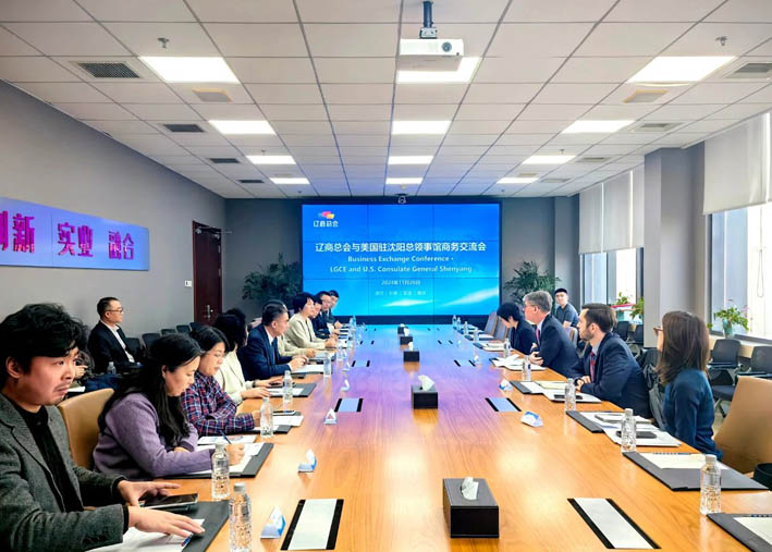 11月20日,美國駐沈陽總領事何溯源一行到訪遼商總會。我會輪值會長許寶平、副會長蔡永偉、范存艷、韓光等會見了何溯源一行,并召開商務交流座談會。會議由副秘書長潘忠穎主持。